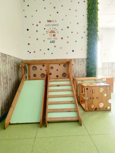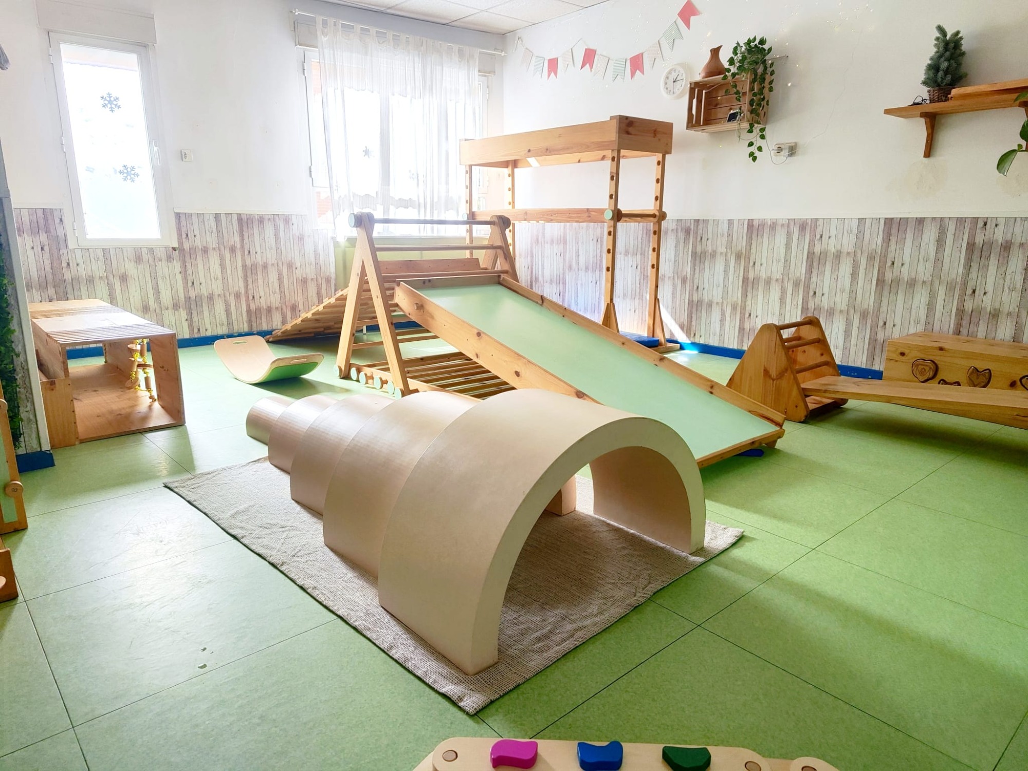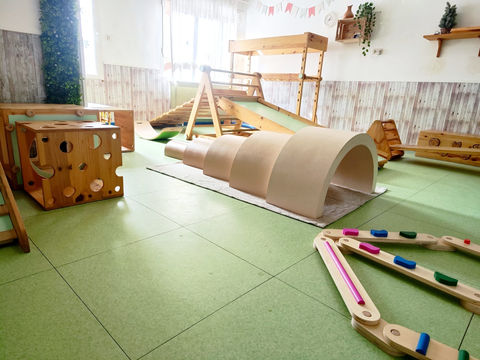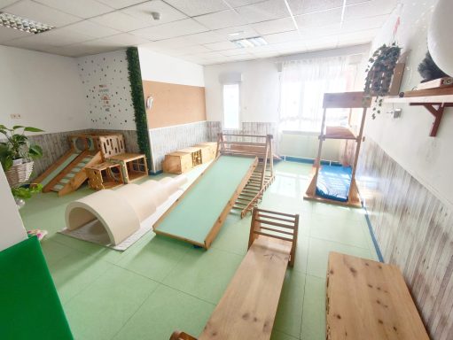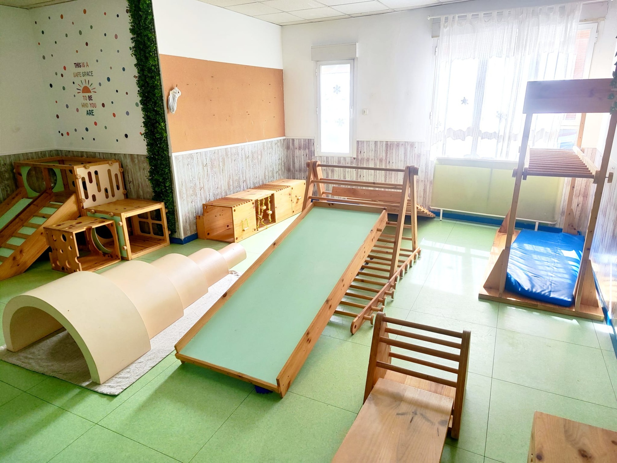 Esta sala consta de unos módulos diseñados y elaborados de forma exclusiva para nuestro centro, inspirados por los materiales utilizados por la Dra. Emmi Pikler.